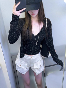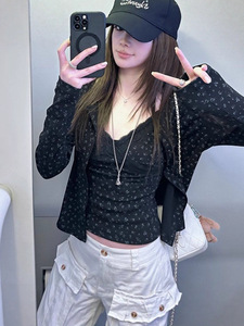 绝美漂亮套装辣妹风蕾丝碎花吊带背心早秋两件套黑色碎花长袖开衫