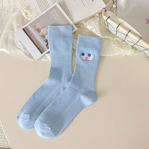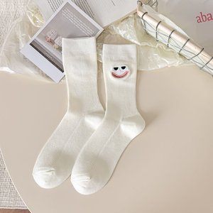 秋季纯棉可爱笑脸大眼睛刺绣搞怪少女新鬼马抽象中筒袜纯色袜子女
