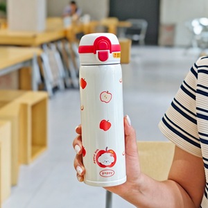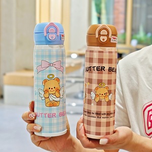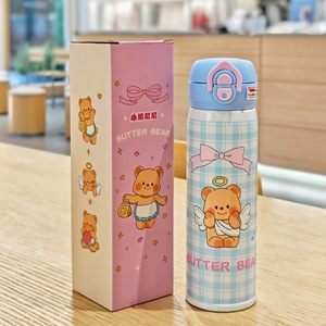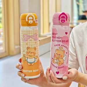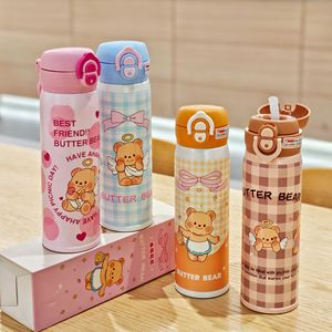 卡通黄油小熊双饮保温杯萌趣吸管杯不锈钢真空杯子高颜值学生水杯