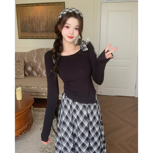 2025秋装新款胖mm大码女优雅蝴蝶结修身上衣复古格子半身裙套装