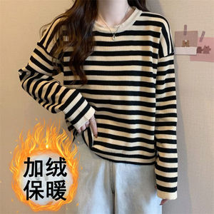 加绒加厚条纹t恤女秋冬季新款洋气漂亮宽松别致长袖上衣打底衫潮
