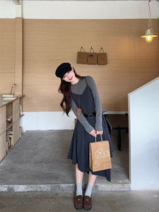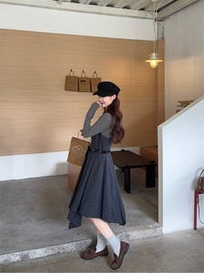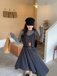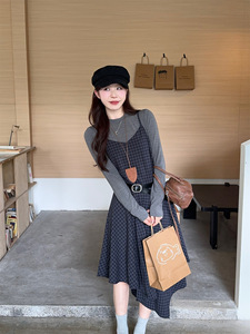 法式复古不规则格子吊带连衣裙长袖T恤女2025秋季新款时尚套装ins