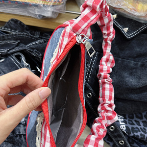 批发韩国2025年新款樱桃字母牛仔单肩包女通勤红白格纹拼色手提包