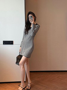实拍 气质老钱风重工提花千鸟格纹针织连衣裙秋冬内搭打底A字裙子