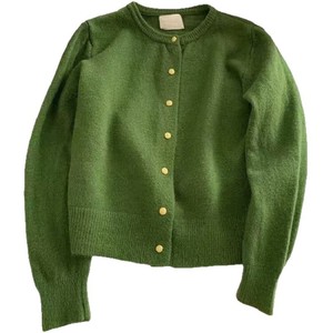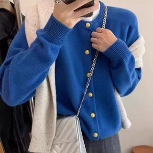 复古金扣开衫女秋冬针织衫纯色圆领长袖毛衣女装针织外套现货批发