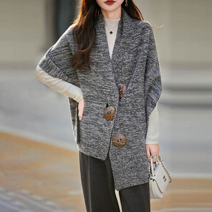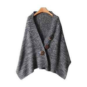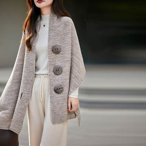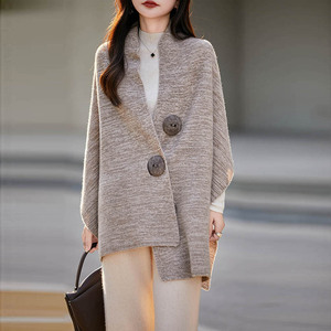 高端针织开衫上衣女秋冬季新款不规则外搭保暖斗篷纯羊毛大扣披肩