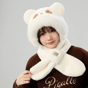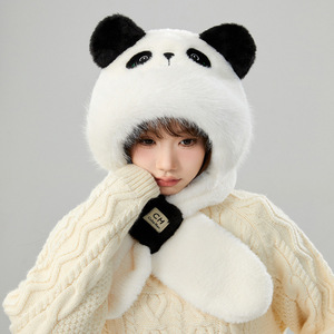 熊猫三件套冬季加厚毛绒帽子手套围巾一体学生冬天骑车防寒保暖帽