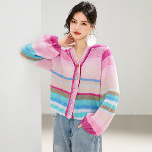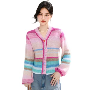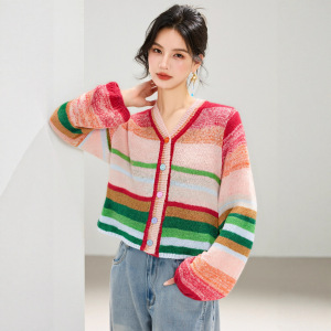 2025秋季新款韩版彩虹撞色开衫毛衣女长袖复古别致灯笼袖针织外套