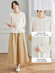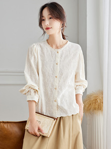 棉茧 蕾丝花边圆领衬衫女长袖2025秋装纯棉刺绣上衣杏色绣花衬衣
