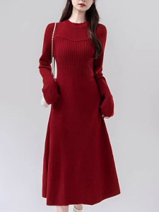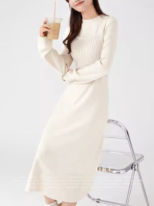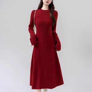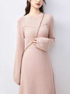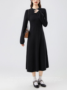 法式温柔风针织连衣裙女秋季收腰设计感女装圆领中长裙显瘦毛衣裙