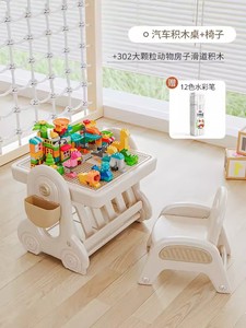 汽车积木桌+椅子+302大颗粒动物房子滑道积木【送画笔】
