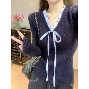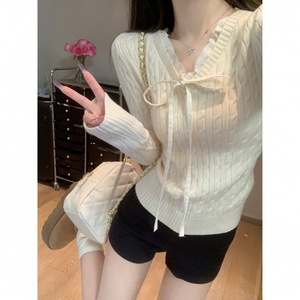 法式麻花蝴蝶结系带v领针织衫毛衣女秋冬新款内搭修身打底衫上衣