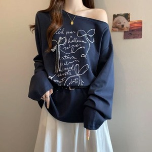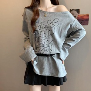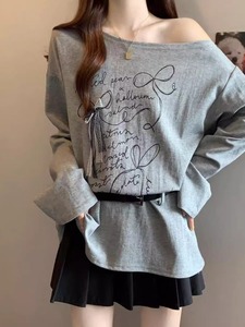 慵懒风灰色斜肩露肩长袖T恤女2025秋新款大码胖mm带皮带收腰上衣