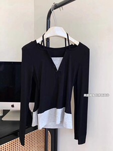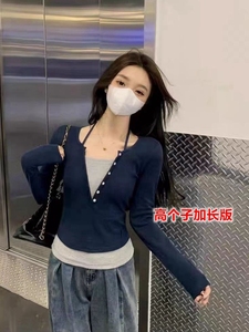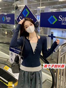 高个子加长撞色V领假两件T恤女秋修身显瘦挂脖内搭打底衫上衣外穿