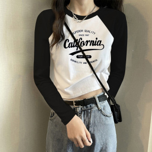 字母正肩长袖t恤女春秋打底衫设计感小众显瘦高腰短款小个子上衣