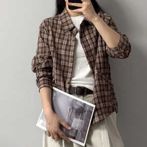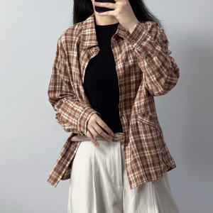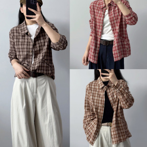 宽松棉麻大码复古格子衬衫外套女春秋款设计感小众宽松长袖上衣女