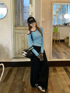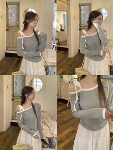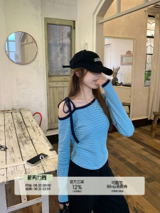 乌77设计感条纹斜肩系带长袖t恤女小个子通勤褶皱修身显瘦上衣秋