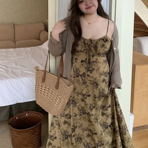 大码女装胖mm秋季新款法式复古收腰遮肚子显瘦吊带碎花连衣裙长裙