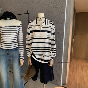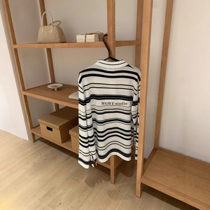 【WGWE】法式复古条纹薄款宽松防晒罩衫休闲翻领上衣针织衫W7013#