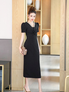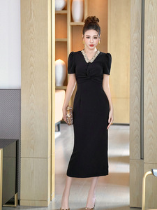 2025夏季新款女法式重工V领修身过膝正式场合包臀黑色连衣裙9085