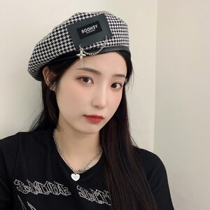 鬼马系少女~拽酷时髦金属贴布黑白千鸟格贝雷帽日系复古画家帽潮
