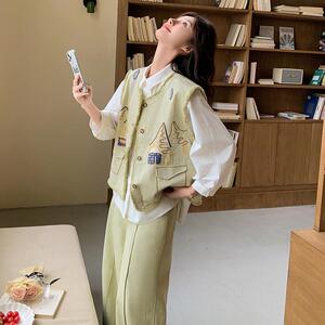 复古涂鸦刺绣牛仔马甲阔腿裤三件套女2025秋季新款超火穿搭一整套