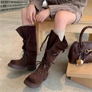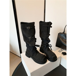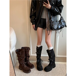 香港英伦风真皮骑士靴女2025秋冬新款粗跟褶皱堆堆靴皮带扣时装靴