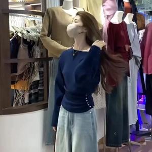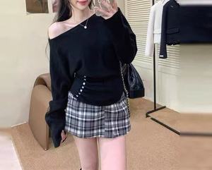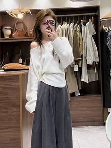 气质斜领设计感露肩长袖毛衣女秋季新款时髦个性褶皱收腰针织上衣