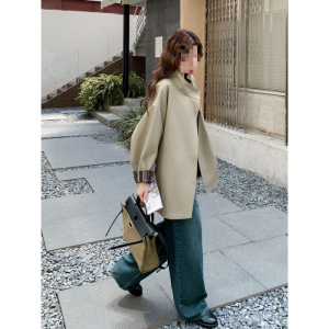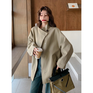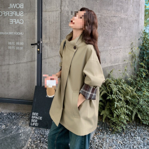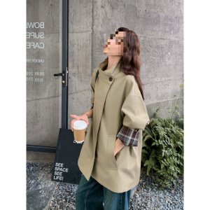 卡其绿格子撞色拼接英伦风外套女2025春秋新款正流行韩系极简风衣