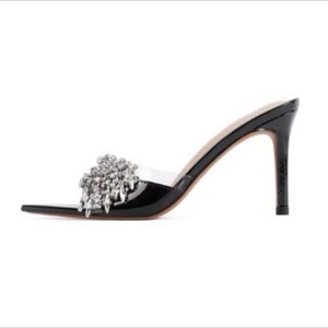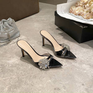 WO惠州市2025夏季女外穿水钻高跟拖鞋尖头细跟时尚一字欧美感轻奢