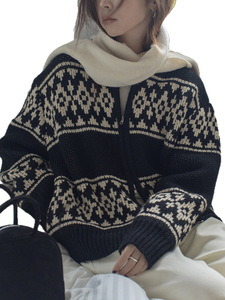 韩版chic秋冬法式复古立领撞色提花设计宽松休闲长袖针织开衫毛衣