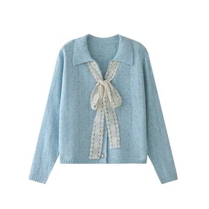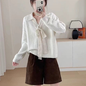 YS韩系蝴蝶结系带毛衣外套秋冬新款宽松polo领小金扣针织开衫上衣
