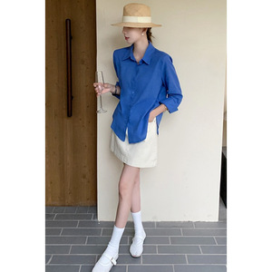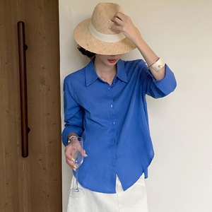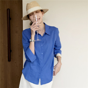 2025法式克莱因蓝亚麻衬衫女夏季老钱风衬衣长袖防晒棉麻上衣