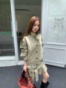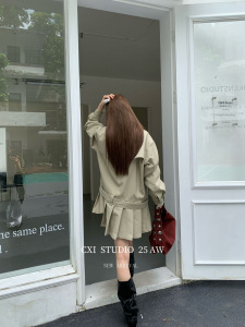 CXI韩系英伦风收腰连衣裙女秋季新款立领风衣百褶裙外套裙子ins风