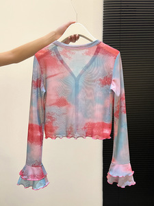 设计感彩色晕染木耳边开衫女2025早秋新款韩系超仙百搭喇叭袖上衣