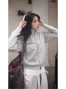 灰色卫衣外套女款正肩短款2025新款立领小个子早秋薄修身开衫上衣