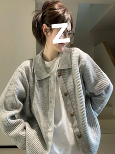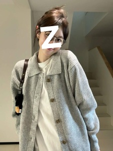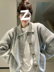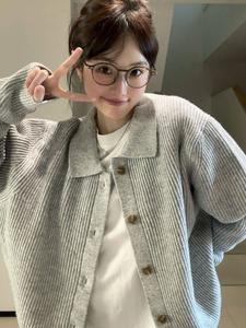oversize!灰色翻领单排扣毛衣开衫女秋装新款韩版宽松针织衫上衣