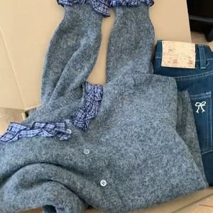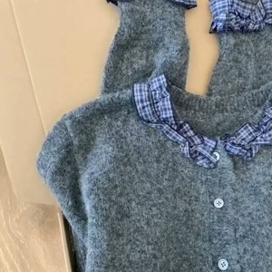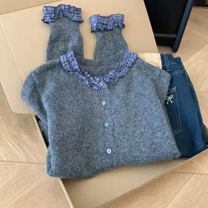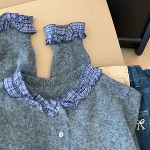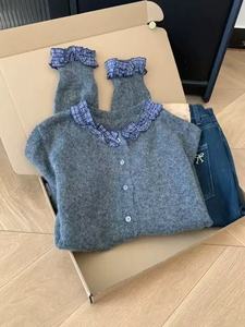 韩系甜美撞色格子拼接针织衫女装秋季复古气质小个子时尚显瘦毛衣