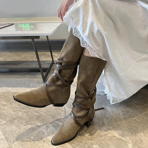 牛翻皮长靴2025年秋冬季尖头低跟高筒靴女鞋堆堆靴时装靴女靴