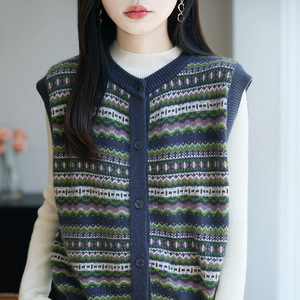 法式复古条纹针织马甲开衫女新款费尔岛提花宽松叠穿女装坎肩上衣