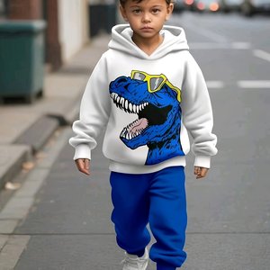 2件套男童酷炫恐龙印花连帽套装,卫衣与长裤套装,秋冬季童装,