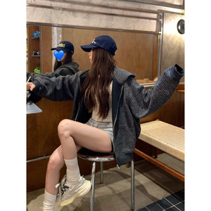 美式复古韩系连帽卫衣外套女秋季慵懒风宽松条纹撞色开衫百搭上衣