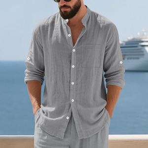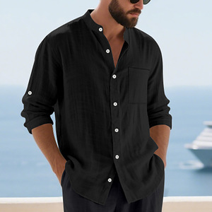 跨境男装亚马逊秋季款亚麻衬衫男沙滩休闲纽扣立领开衫长袖衬衣男