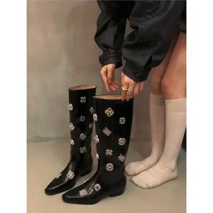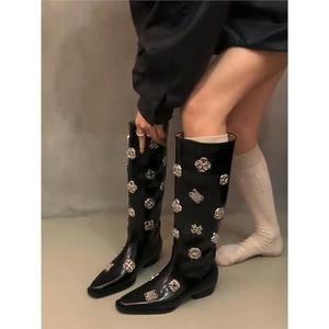 牛皮版!靴子女款长筒靴小众设计感黑色尖头金属扣百搭粗跟骑士靴