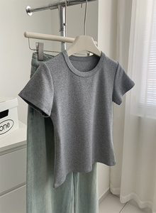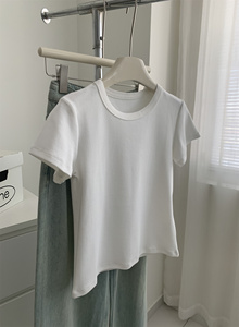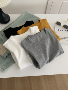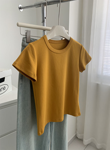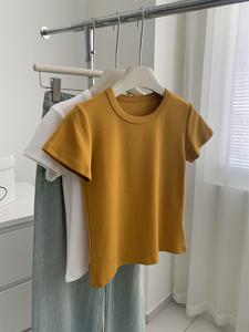 气质显白姜黄色莱卡棉T恤女韩版小个子显瘦百搭正肩短袖打底衫秋