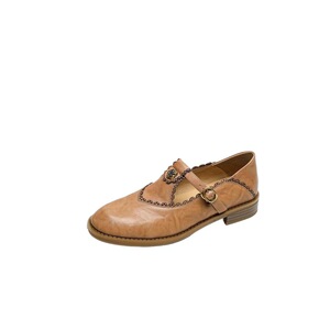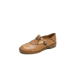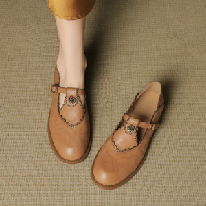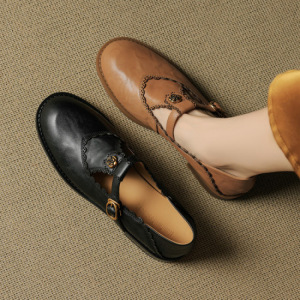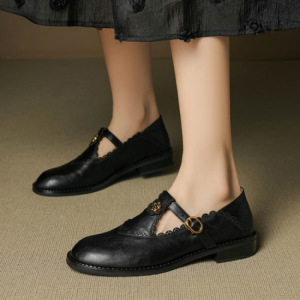 头层牛皮34-40码2026年春秋季圆头低跟真皮单鞋女鞋T型鞋丁字鞋