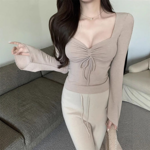 设计感褶皱系带长袖T恤女2025年早秋德绒纯欲辣妹修身短款上衣女