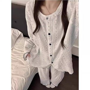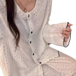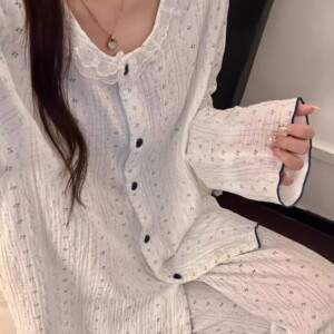 原创秋季韩版印花女款云朵棉睡衣两件套新款蕾丝拼接家居服