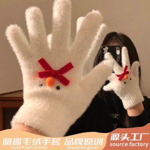 可爱蝴蝶结雪人毛绒针织五指手套女冬季保暖加绒加厚骑行防寒防风