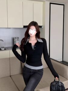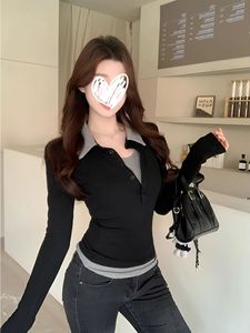 黑色辣妹假两件polo正肩长袖t恤女春季修身显瘦纯欲镂空短款上衣